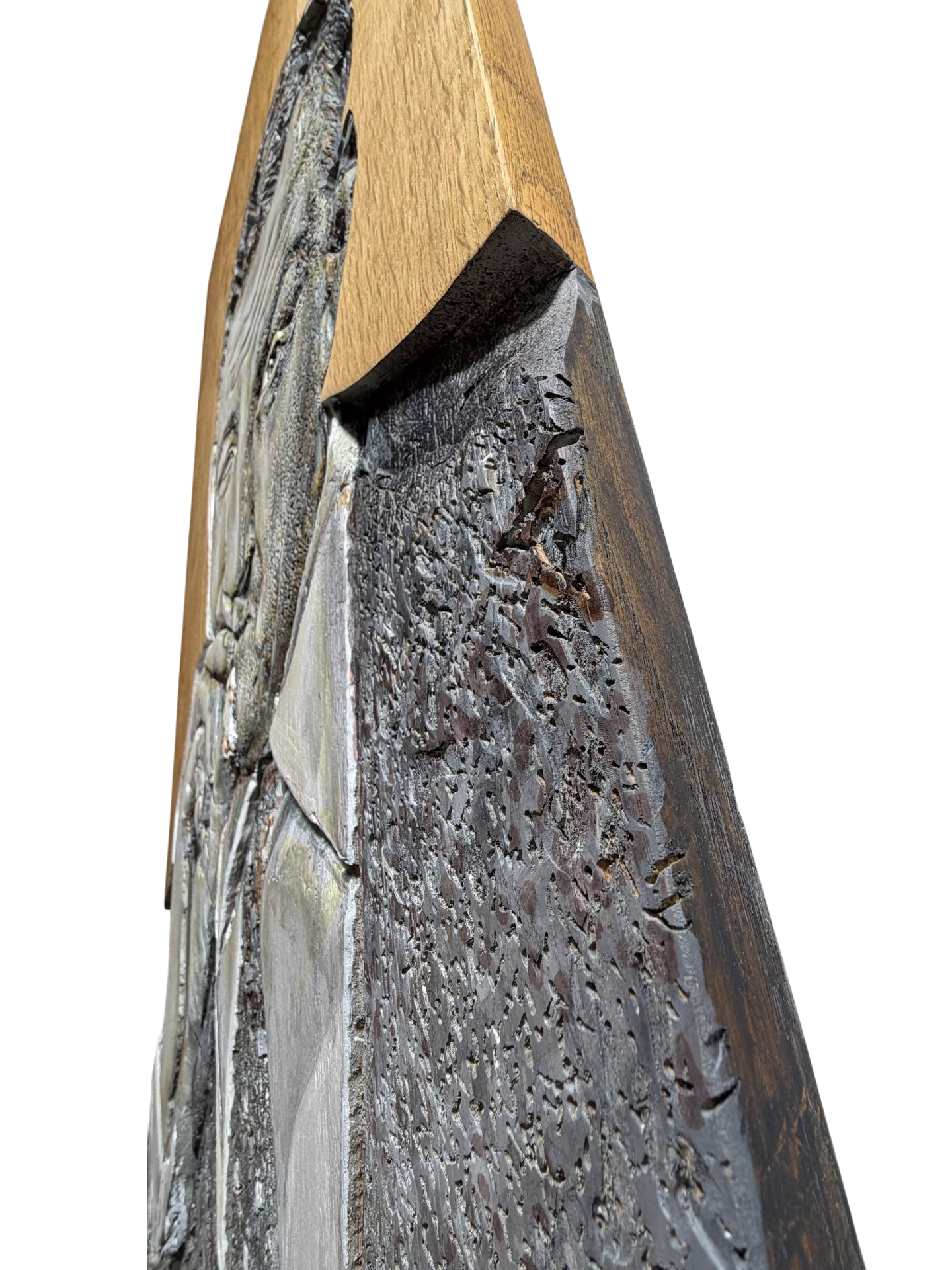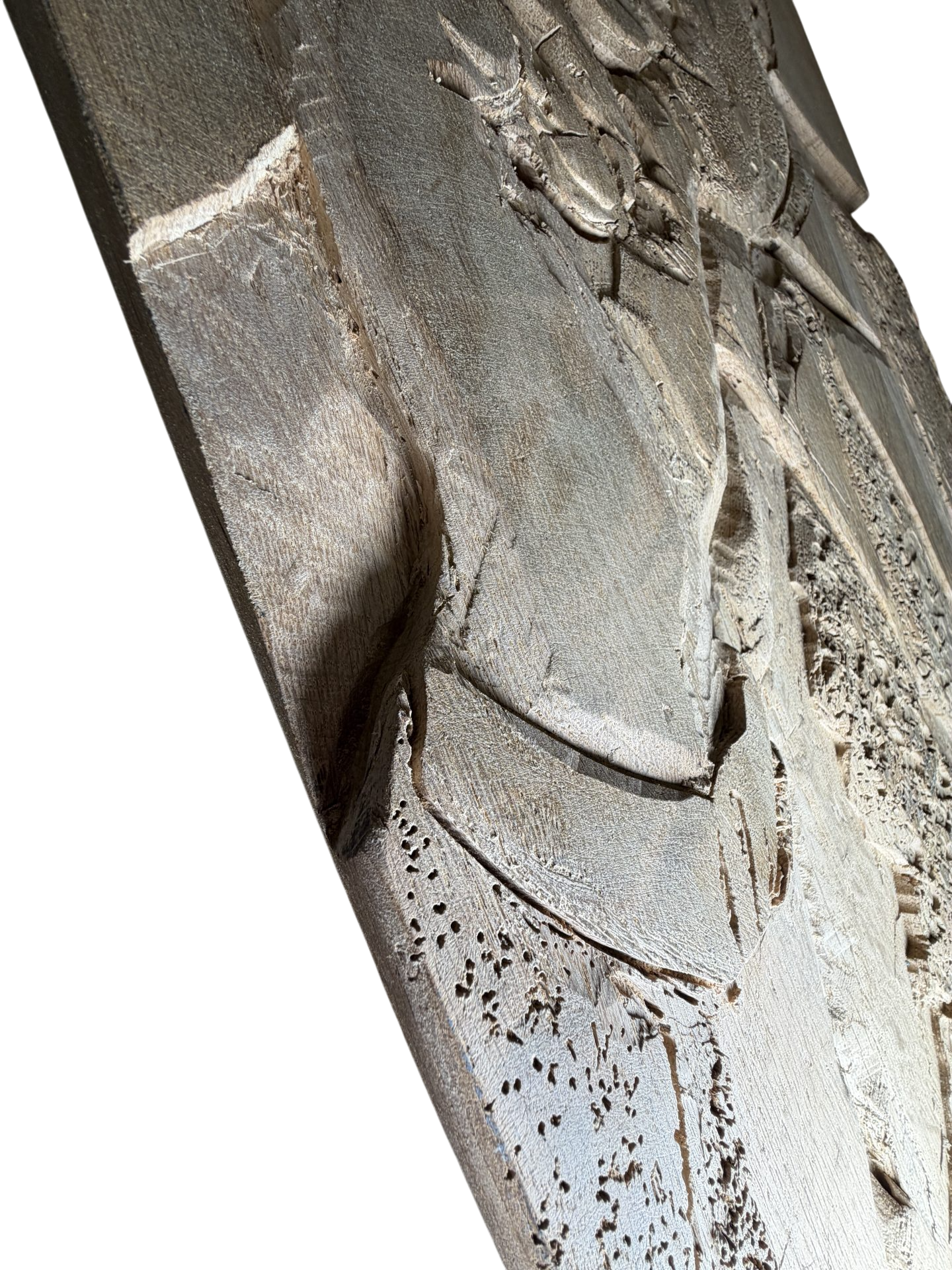 - Matériau d’Exception : Le choix du chêne massif n’est pas anodin ; sa densité et son grain prononcé mettent en valeur la sculpture et la profondeur du bas-relief.