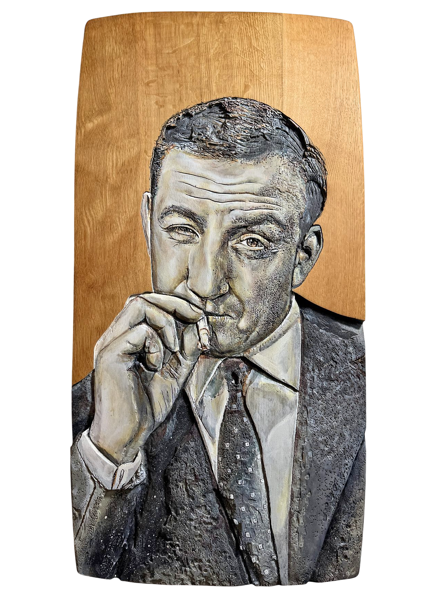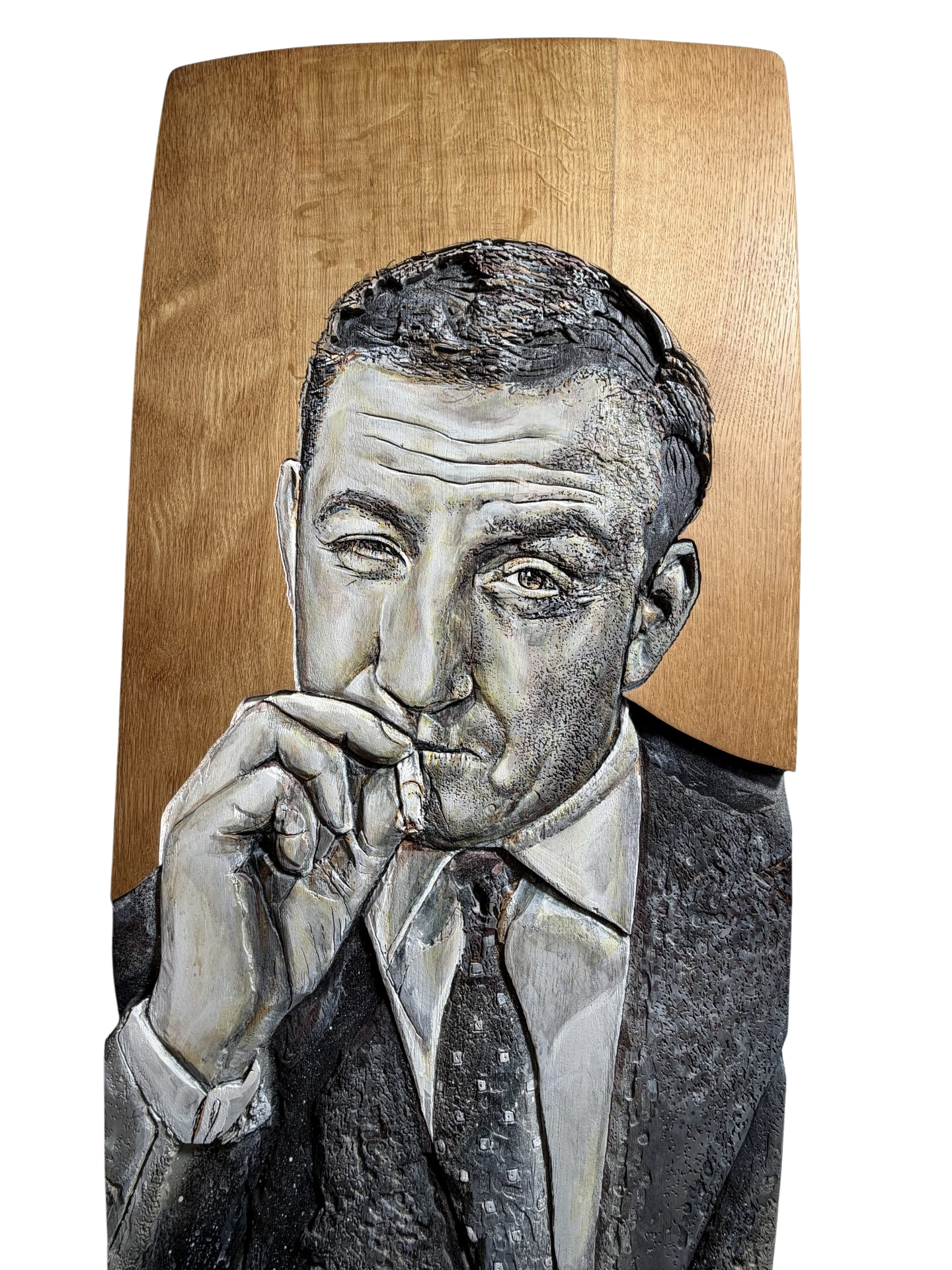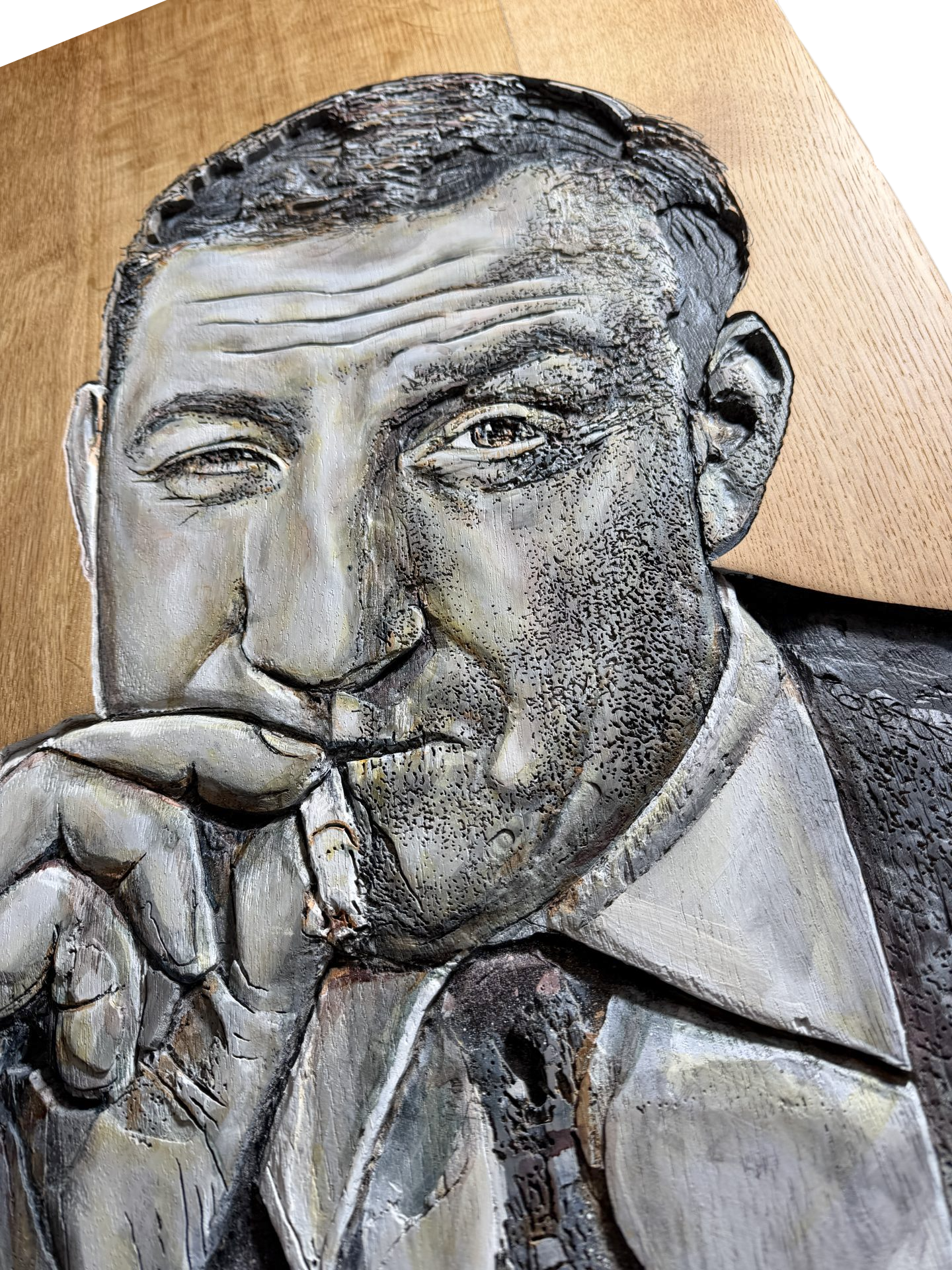 Décoration murale, tableau décoratif : portrait de Lino Ventura (Fernand Naudin), sculpté et peint à la main sur chêne massif.