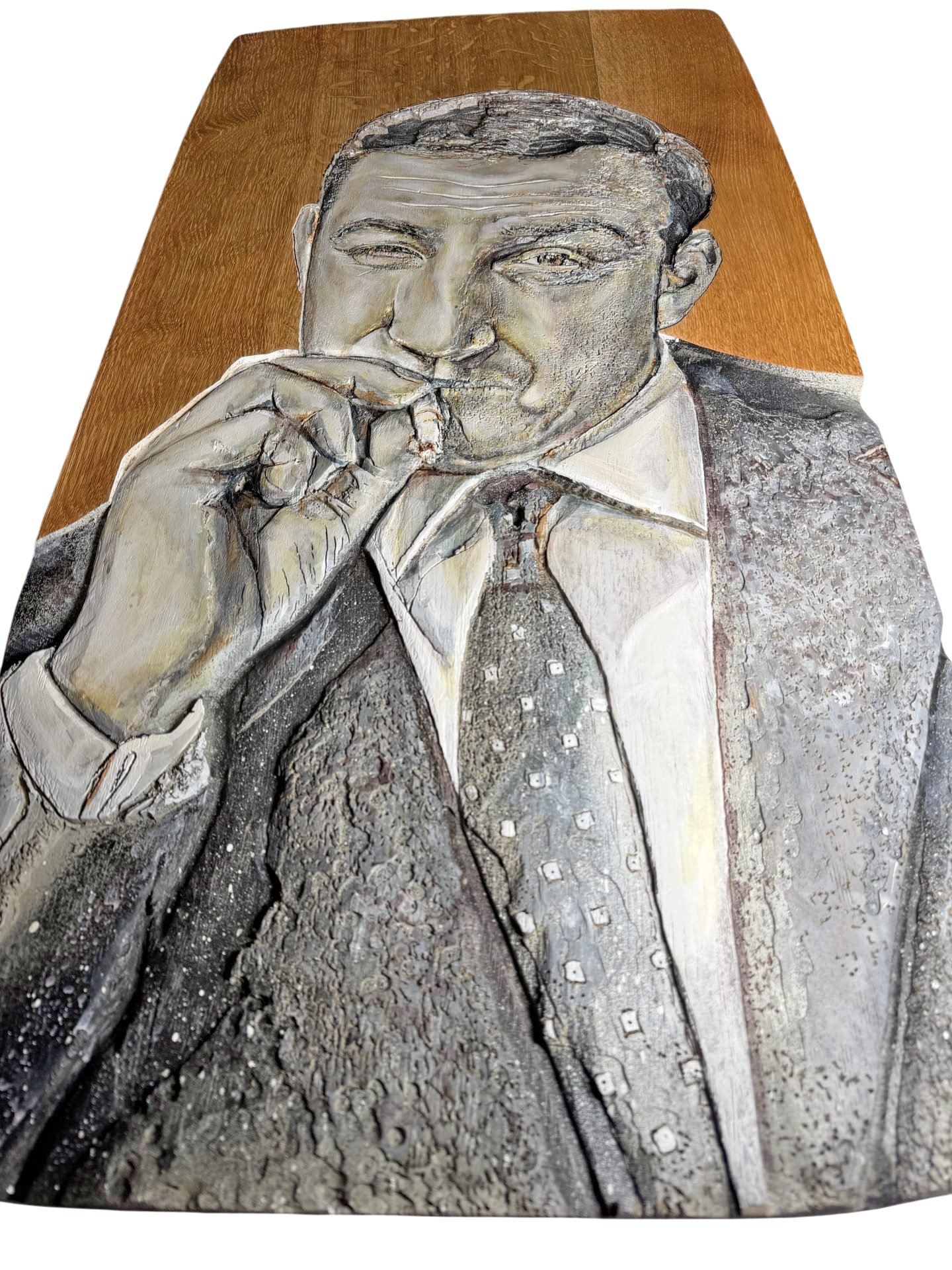 Ce tableau décoratif est une pièce d’exception, un véritable bas-relief gravé et peint à la main sur un panneau de bois de chêne encollé, un matériau noble qui confère force et caractère à l’œuvre. Chaque fibre de ce bois robuste magnifie le portrait de l’acteur.