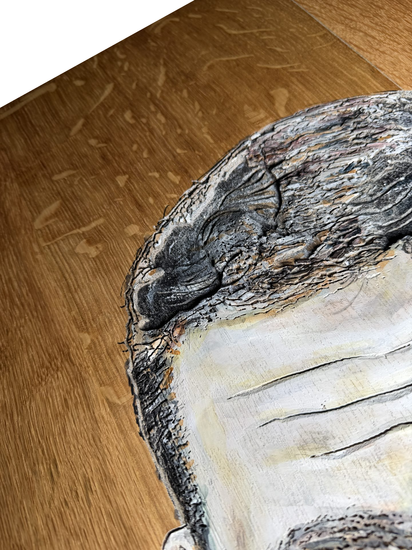 - Dimensions Imposantes : Mesurant plus d’un mètre de haut, ce portrait en nuances sombres et claires impose sa présence et capte immédiatement le regard.