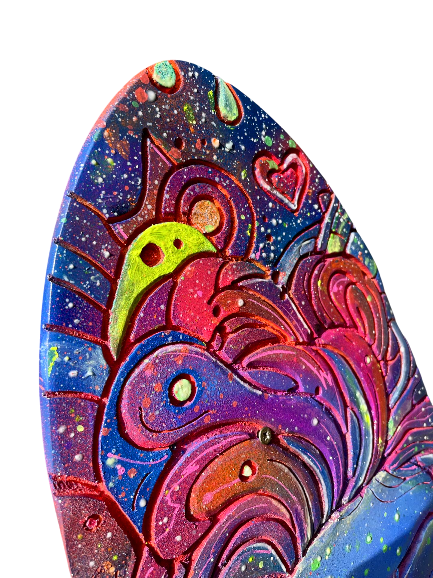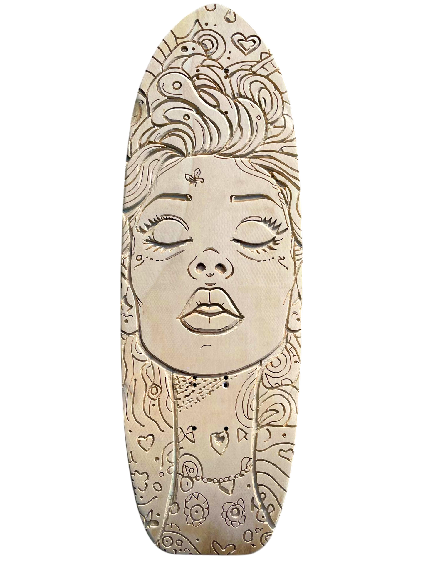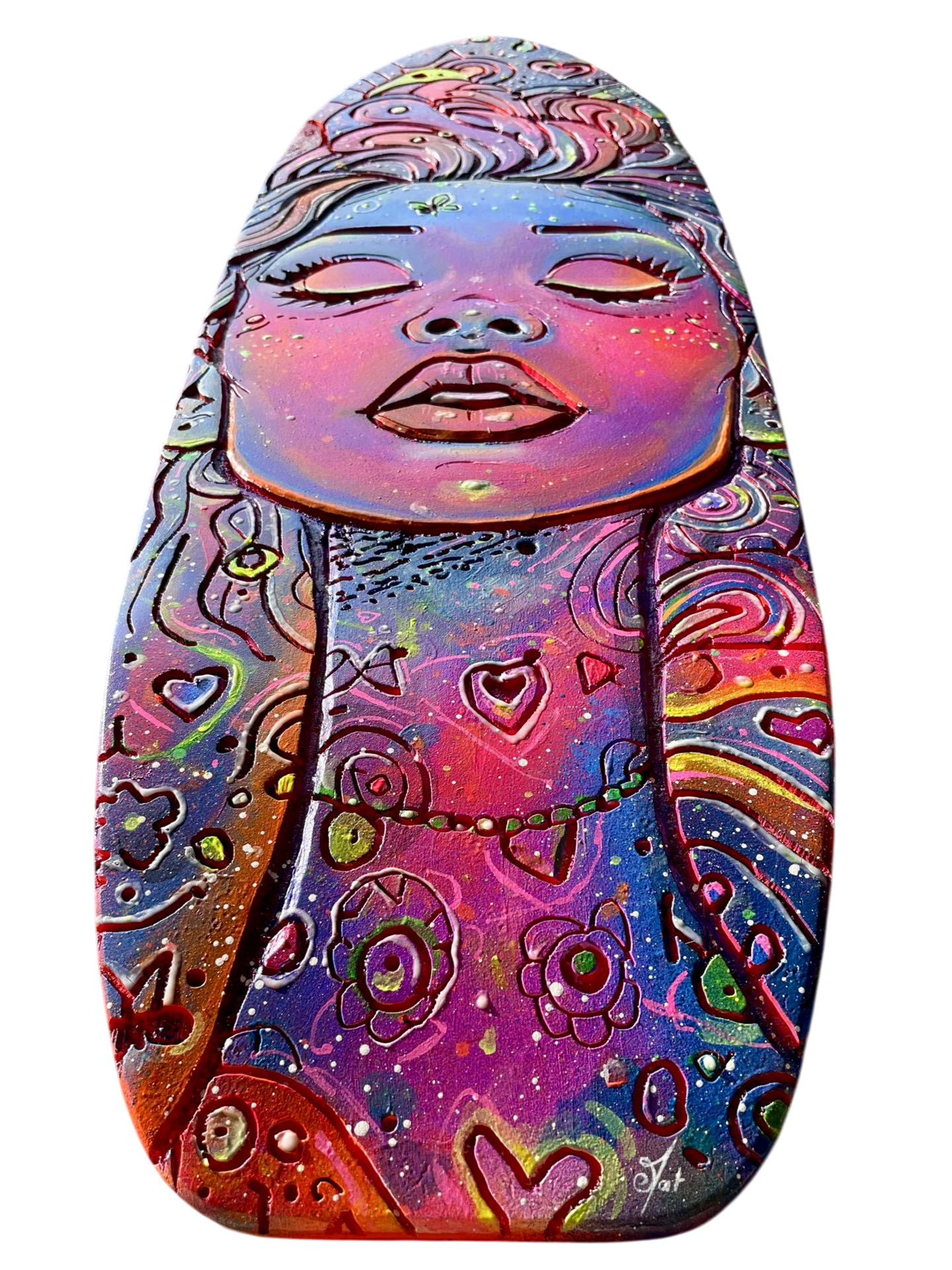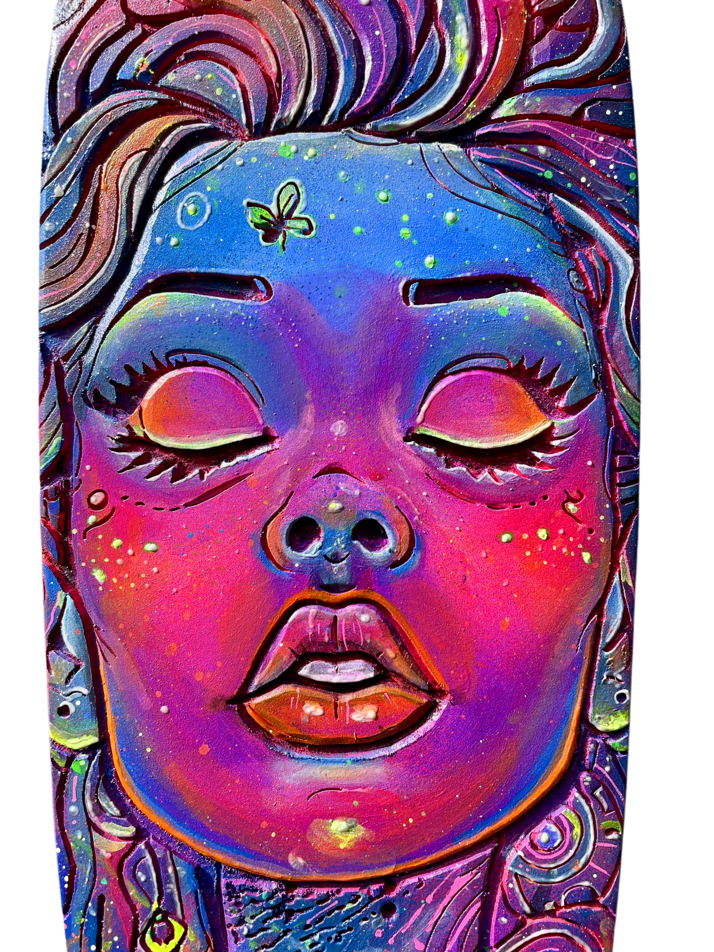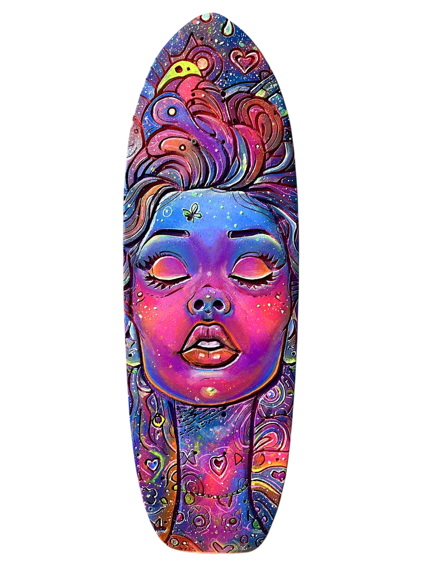 Découvrez Cosmic Woman, une pièce d’art vibrante et mystérieuse, directement gravée et peinte à la main sur une vraie planche de skateboard en bois naturel 🎨. Son visage serein aux yeux clos est entouré d’un tourbillon de motifs psychédéliques, de planètes et d’étoiles qui semblent murmurer des secrets de l’univers 🌌. C’est l’incarnation parfaite du street art et de la spiritualité urbaine.