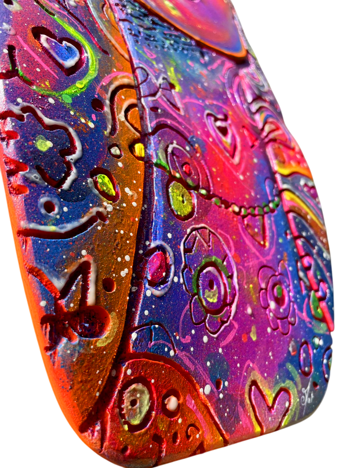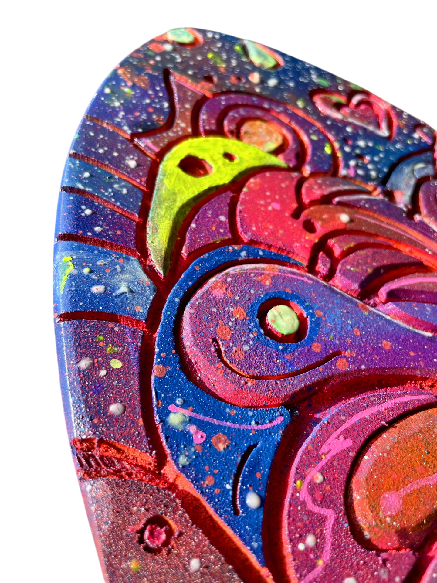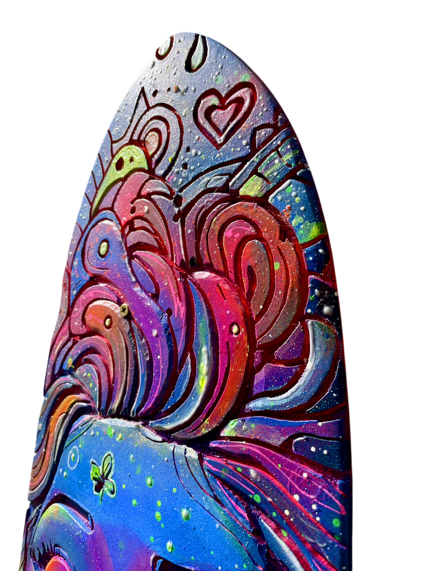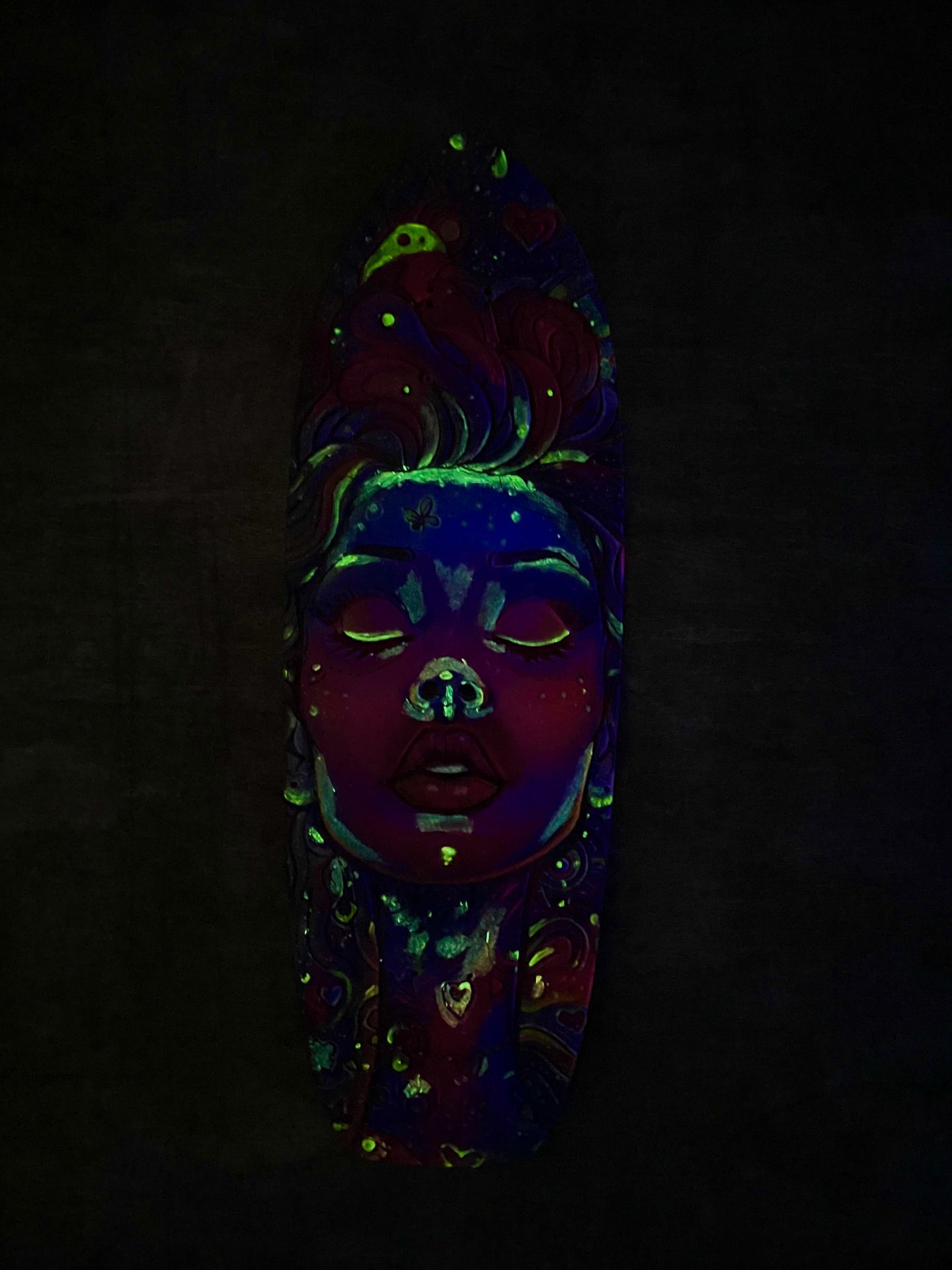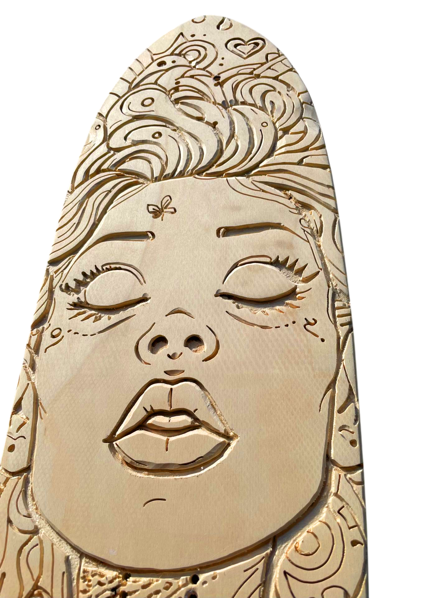 Découvrez Cosmic Woman, une pièce d’art vibrante et mystérieuse, directement gravée et peinte à la main sur une vraie planche de skateboard en bois naturel 🎨. Son visage serein aux yeux clos est entouré d’un tourbillon de motifs psychédéliques, de planètes et d’étoiles qui semblent murmurer des secrets de l’univers 🌌. C’est l’incarnation parfaite du street art et de la spiritualité urbaine.