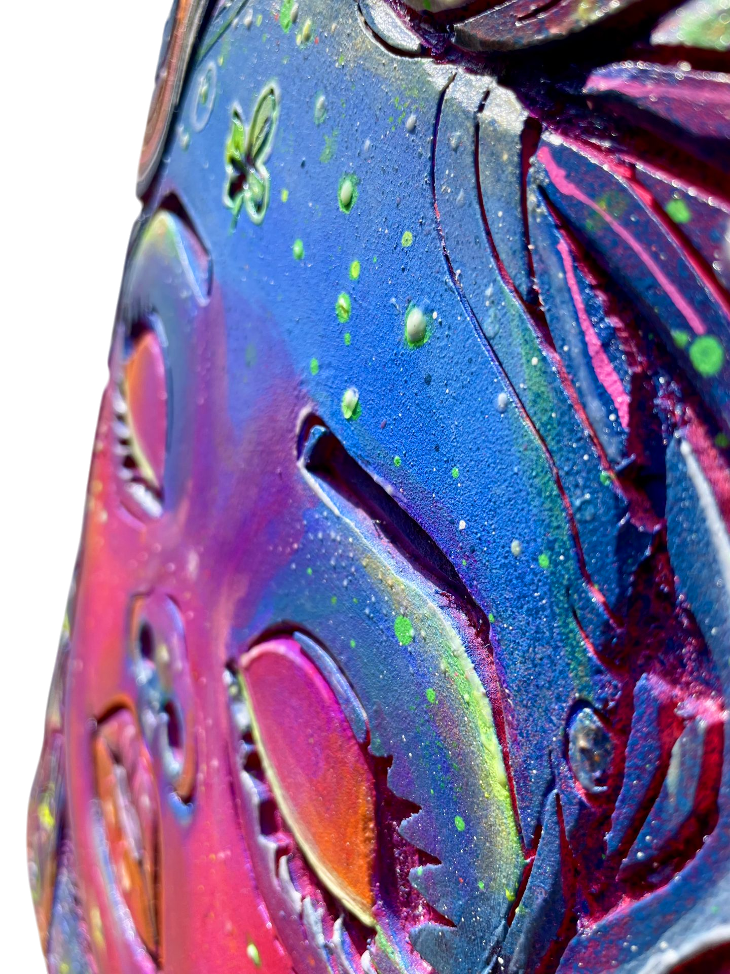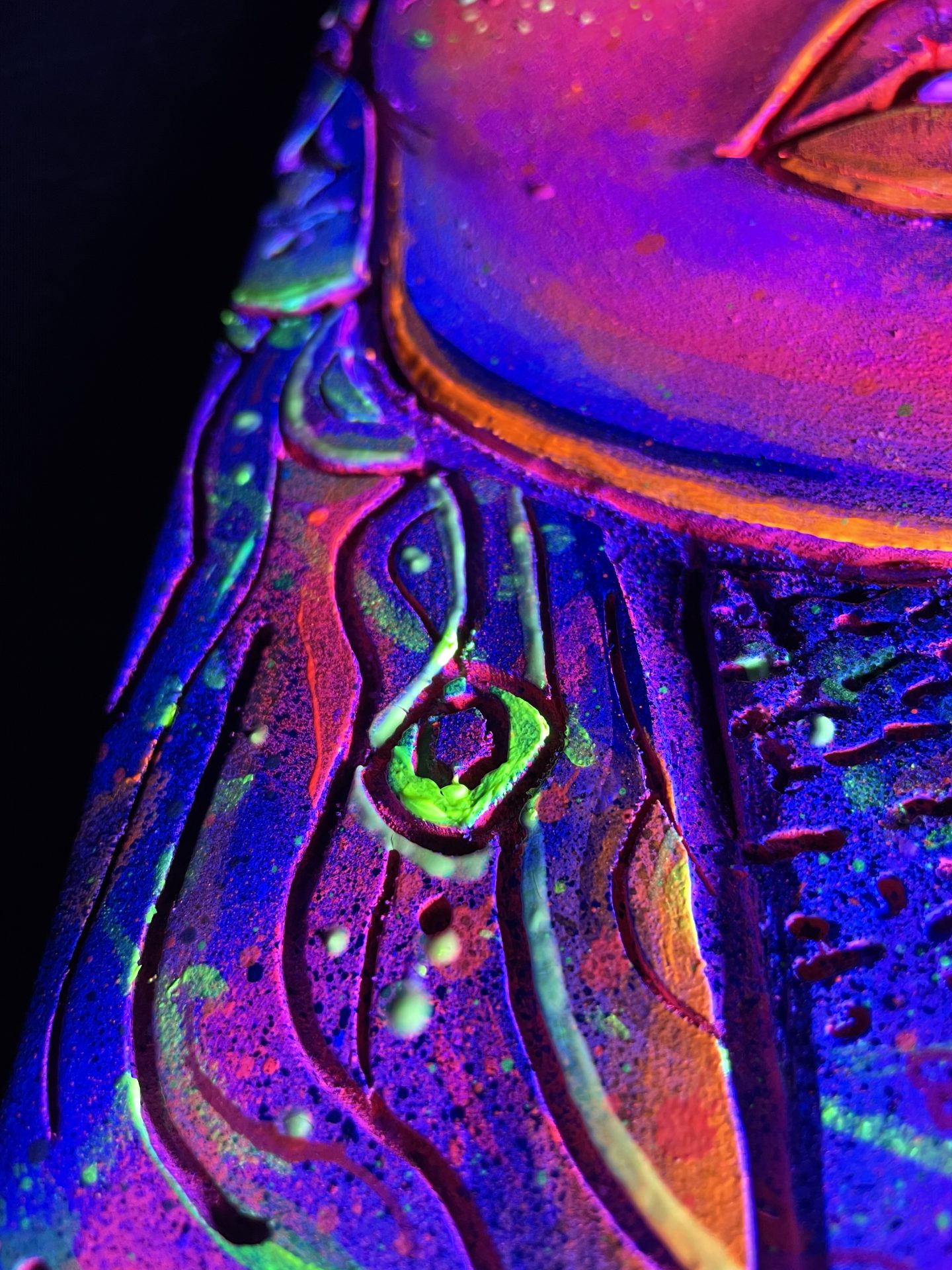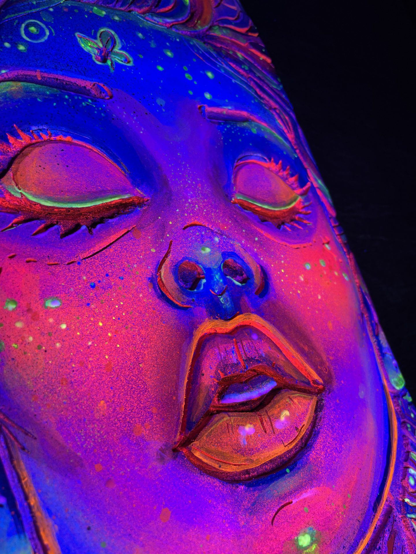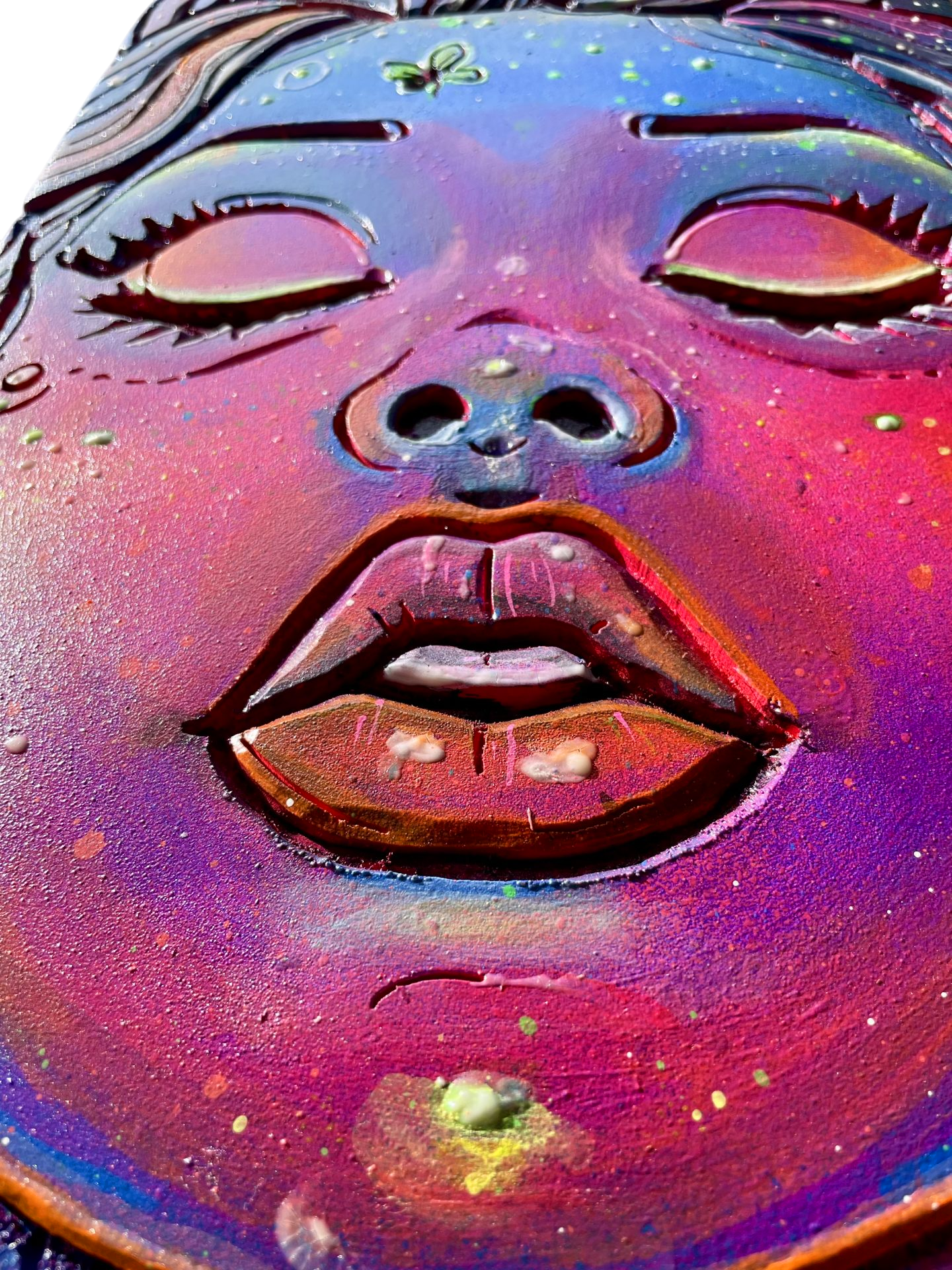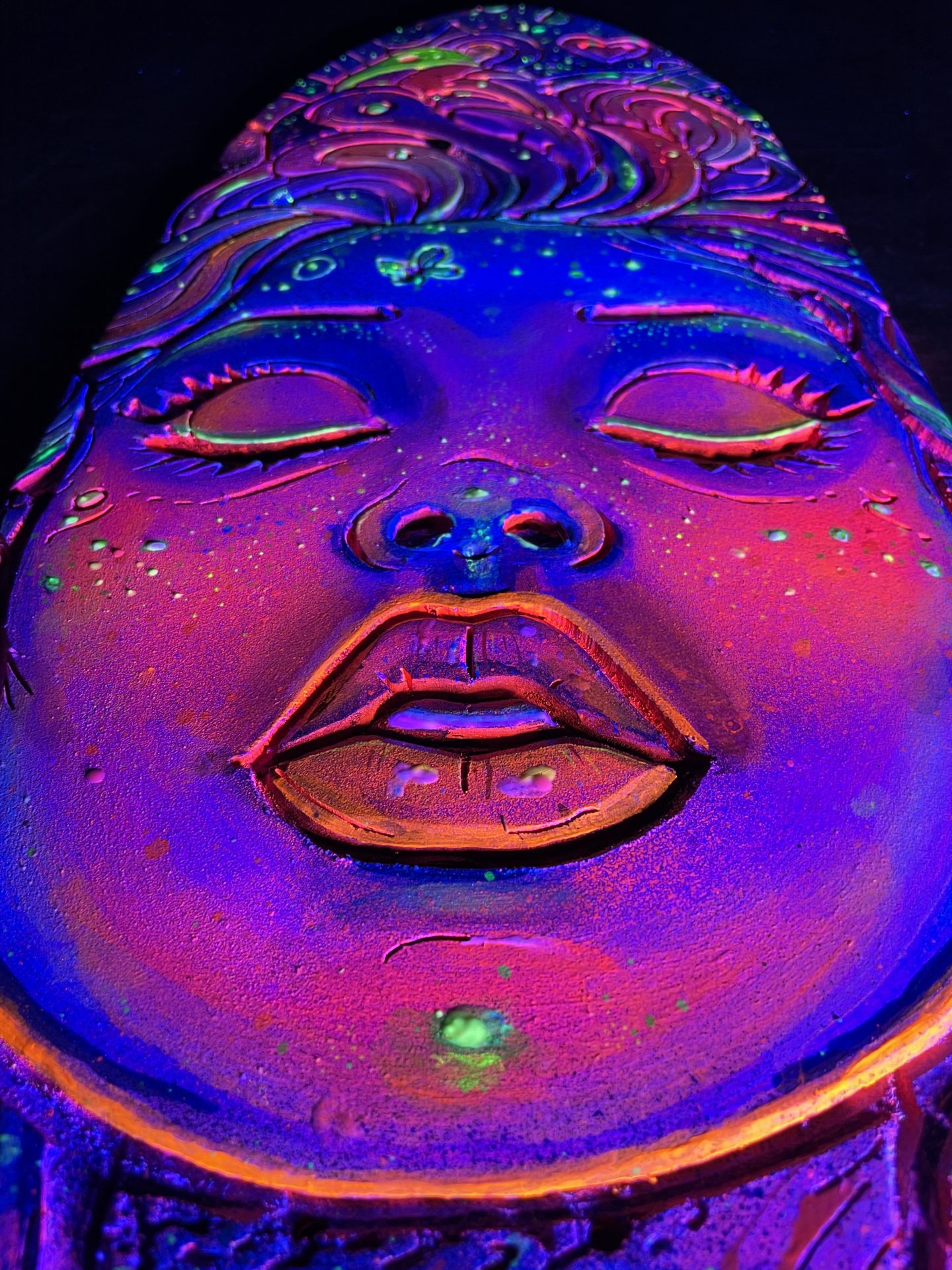 Chaque détail de cette œuvre a été minutieusement travaillé : de la finesse des traits du visage à l’explosion de couleurs cosmiques qui l’entourent. C’est une pièce qui attire le regard et invite à la contemplation, tout en apportant une touche de couleur et de magie à votre espace.